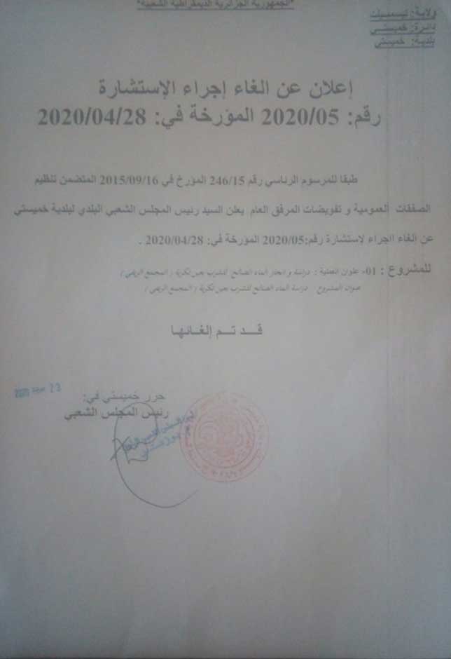 إعلان عن إلغاء إجراء الإستشارة رقم 2020/05انشأ بتاريخ: الخميس، 23 تموز/يوليو 2020 20:00 | نشر بتاريخ: الخميس، 23 تموز/يوليو 2020 20:00