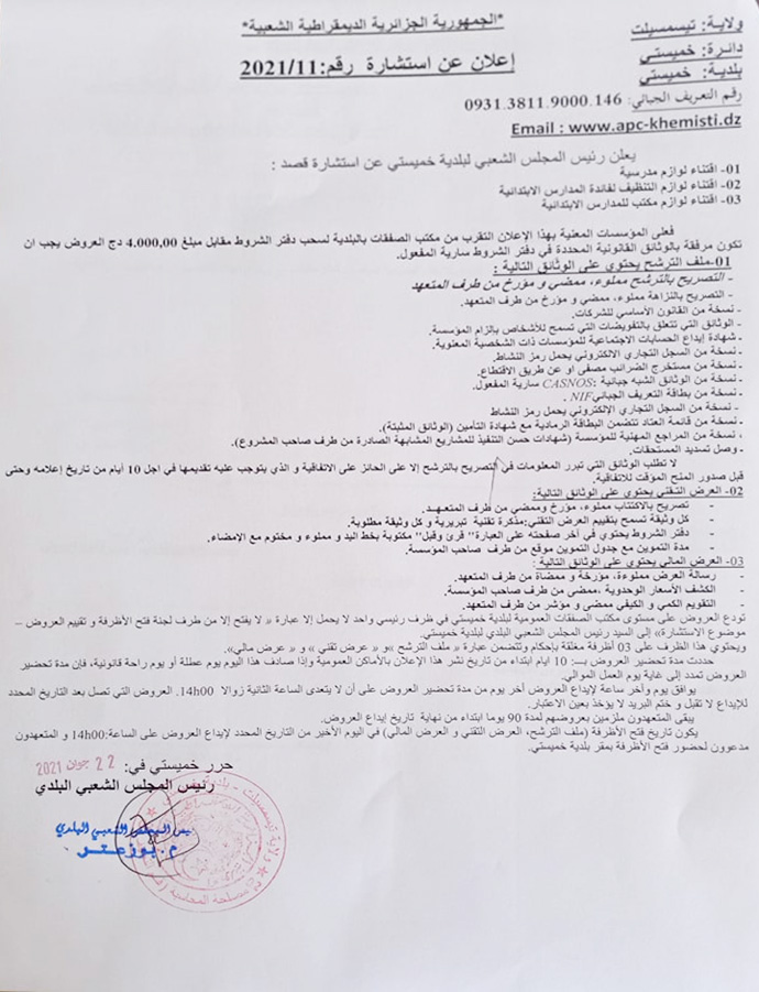 إعلان عن إستشارة رقم 2021/11انشأ بتاريخ: الثلاثاء، 22 حزيران/يونيو 2021 13:05 | نشر بتاريخ: الثلاثاء، 22 حزيران/يونيو 2021 13:05